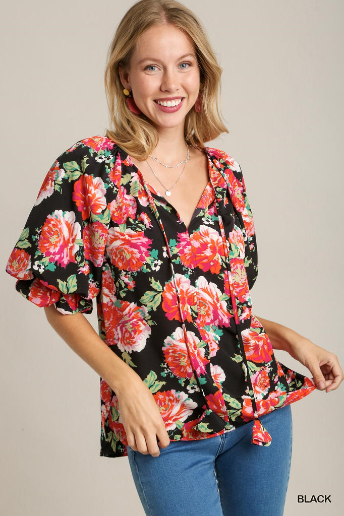 Floral Print Split Neck Top with Side Slit , Balloon Short Sleeve, & Front Drawstring