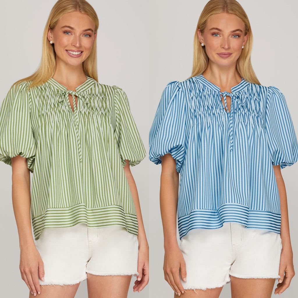 PUFF SLEEVE PINTUCK DETAIL WITH NECK TIE WOVEN STRIPE TOP S:100%POLYESTER L:100%POLYESTER