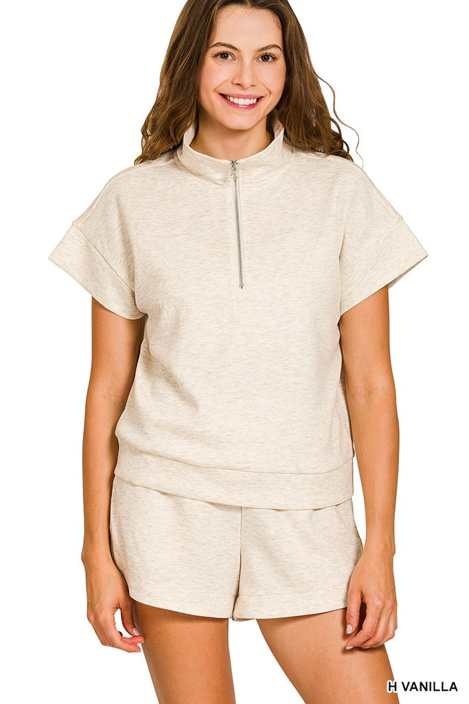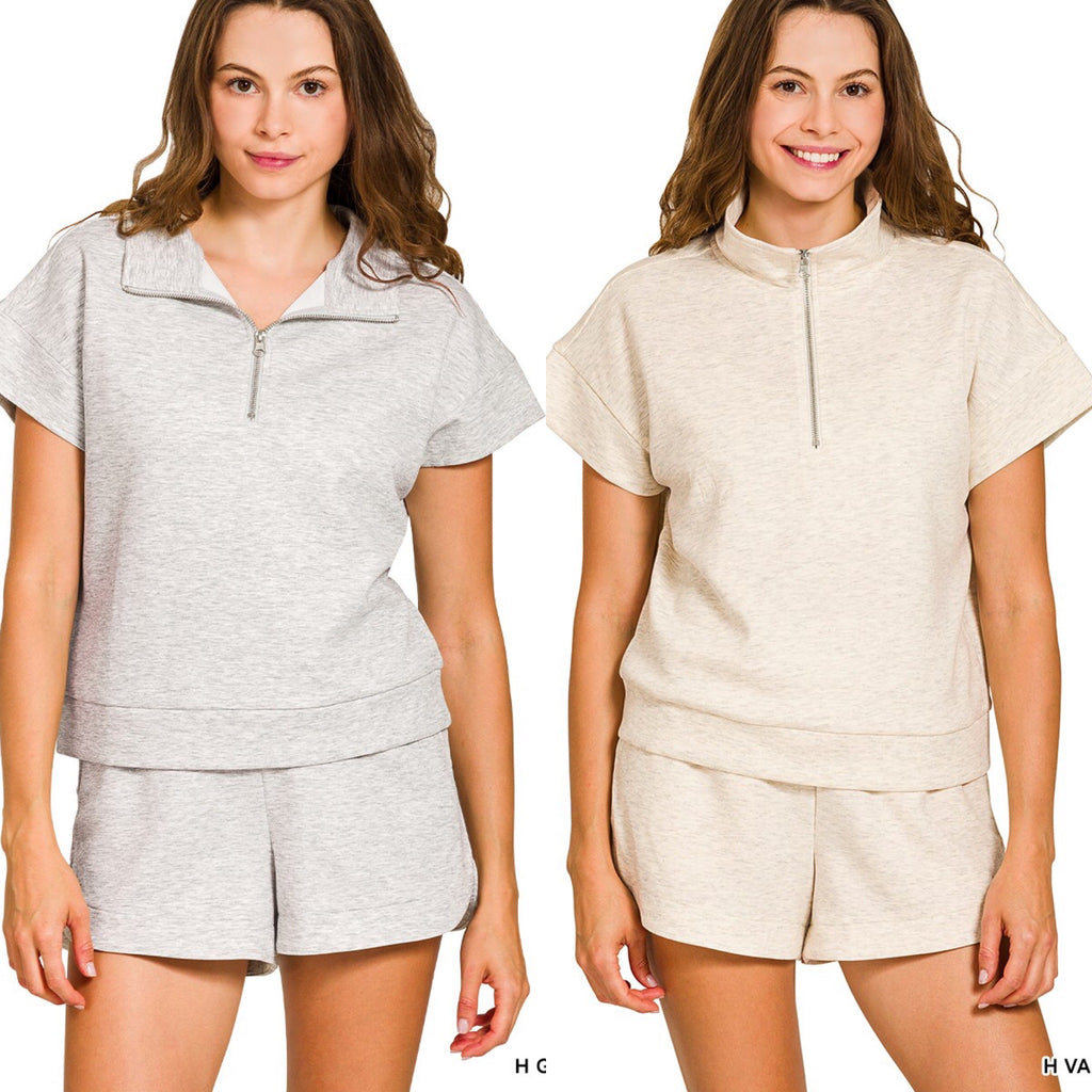 SCUBA HIGH NECK HALF ZIP TOP & DOLPHIN SHORTS SET - DRAWSTRING ELASTIC WAIST SHORTS WITH SIDE POCKETS ** TOP TOTAL BODY LENGTH: 22", BUST: 43" approx. - MEASURED FROM SMALL ** SHORTS TOTAL WAIST: 25.5", INSEAM: 3.5" approx. - MEASURED FROM SMALL ** COLOR MAY VARY SLIGHTLY DUE TO MONITOR RESOLUTION