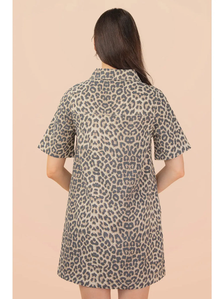 - Leopard Printed Collared Casual Shift Mini Dress - Half Button Down - Short Sleeve - Side Pockets (Model height: 5"9", wearing a Small