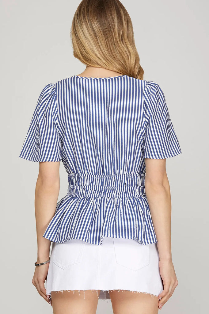 SHORT SLEEVE WOVEN STRIPED TOP WITH ELASTIC WAIST BAND