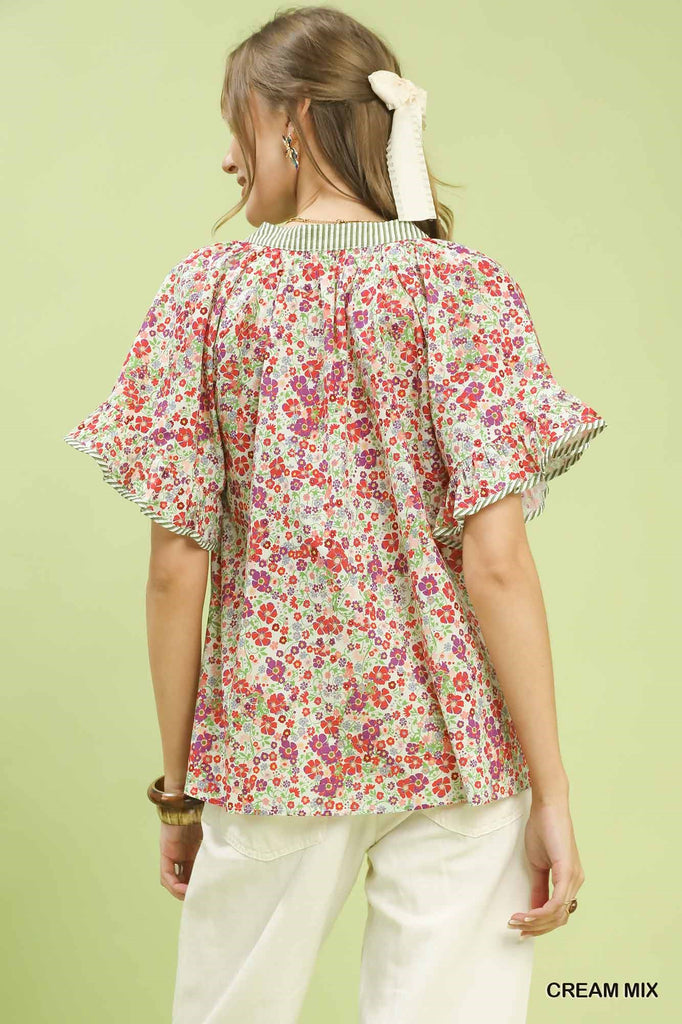 Floral Ruffle Sleeve Contrast Trim Blouse
