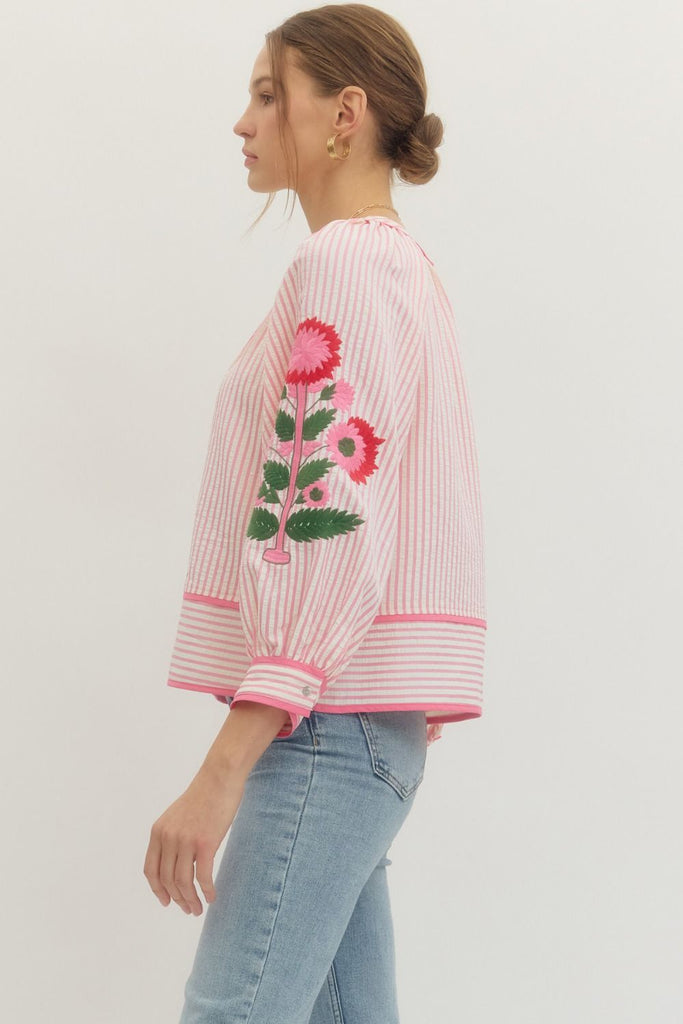 Striped 3/4 puff sleeve top featuring band collar V-neck with contrast binding. Floral embroidery on sleeves. Button closure at cuffs. Unlined. Woven. Non-sheer. Lightweight.
